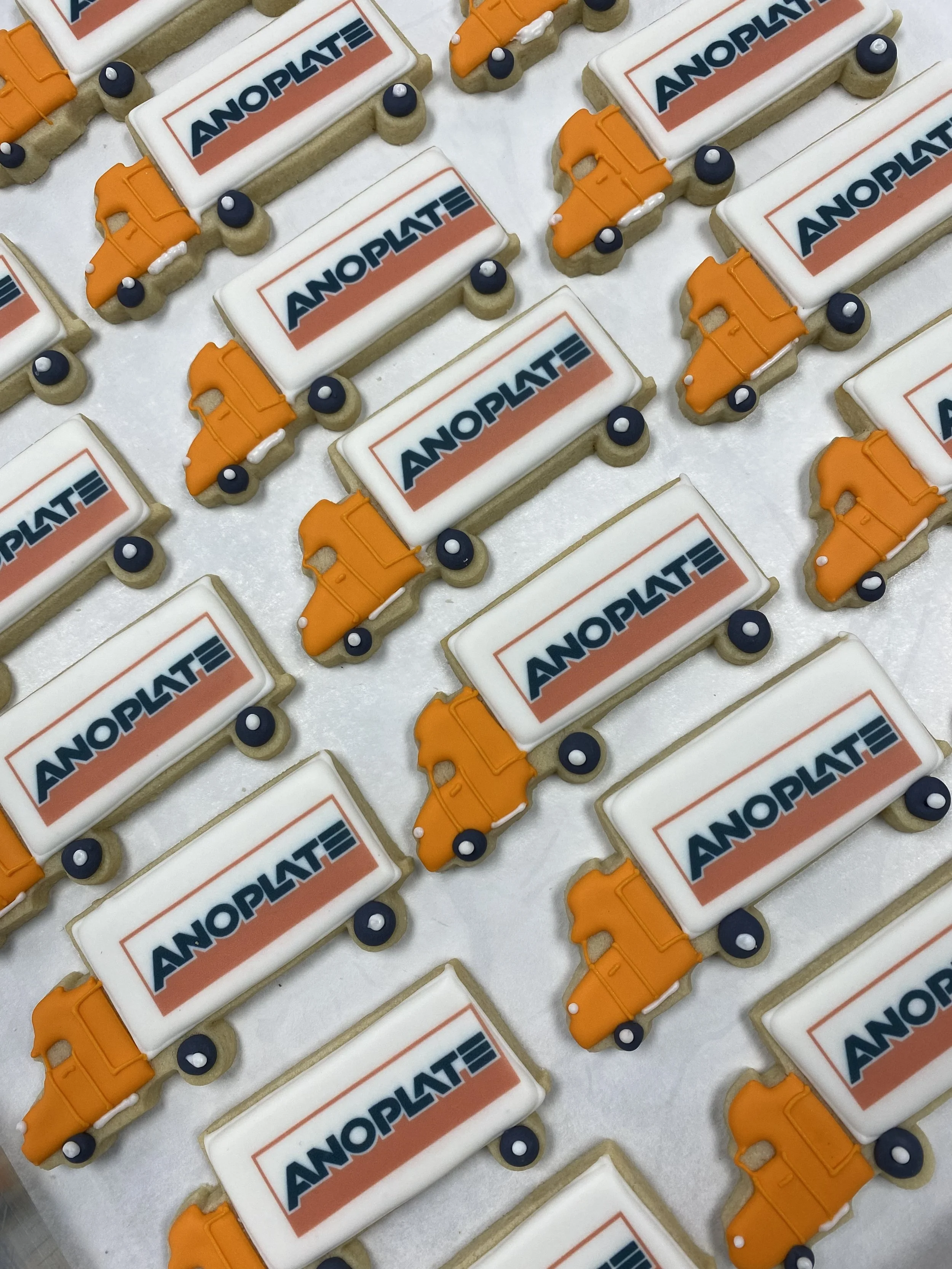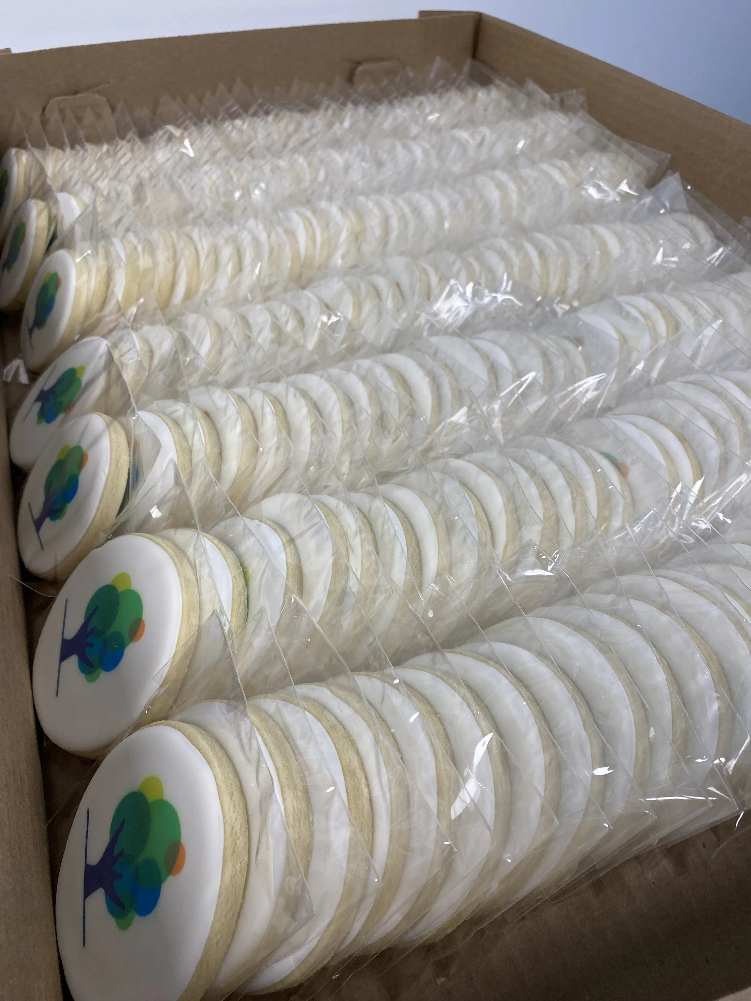 We would love to help take your marketing material/ next client gifts to the next level. Custom logo cookies are available on our standard circle cookie, or select a shape that will work for you. Shipping is available! Please fill out our inquiry form to learn more.